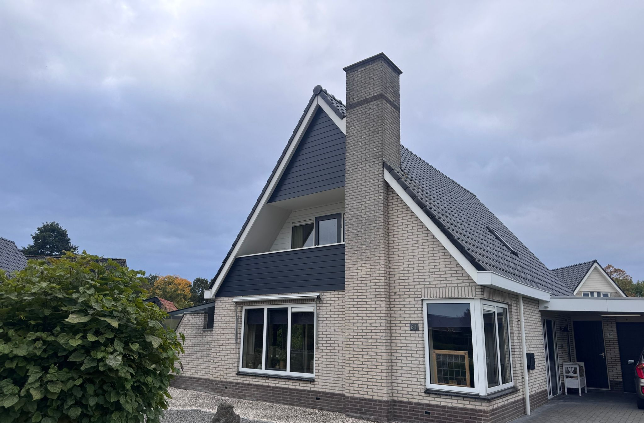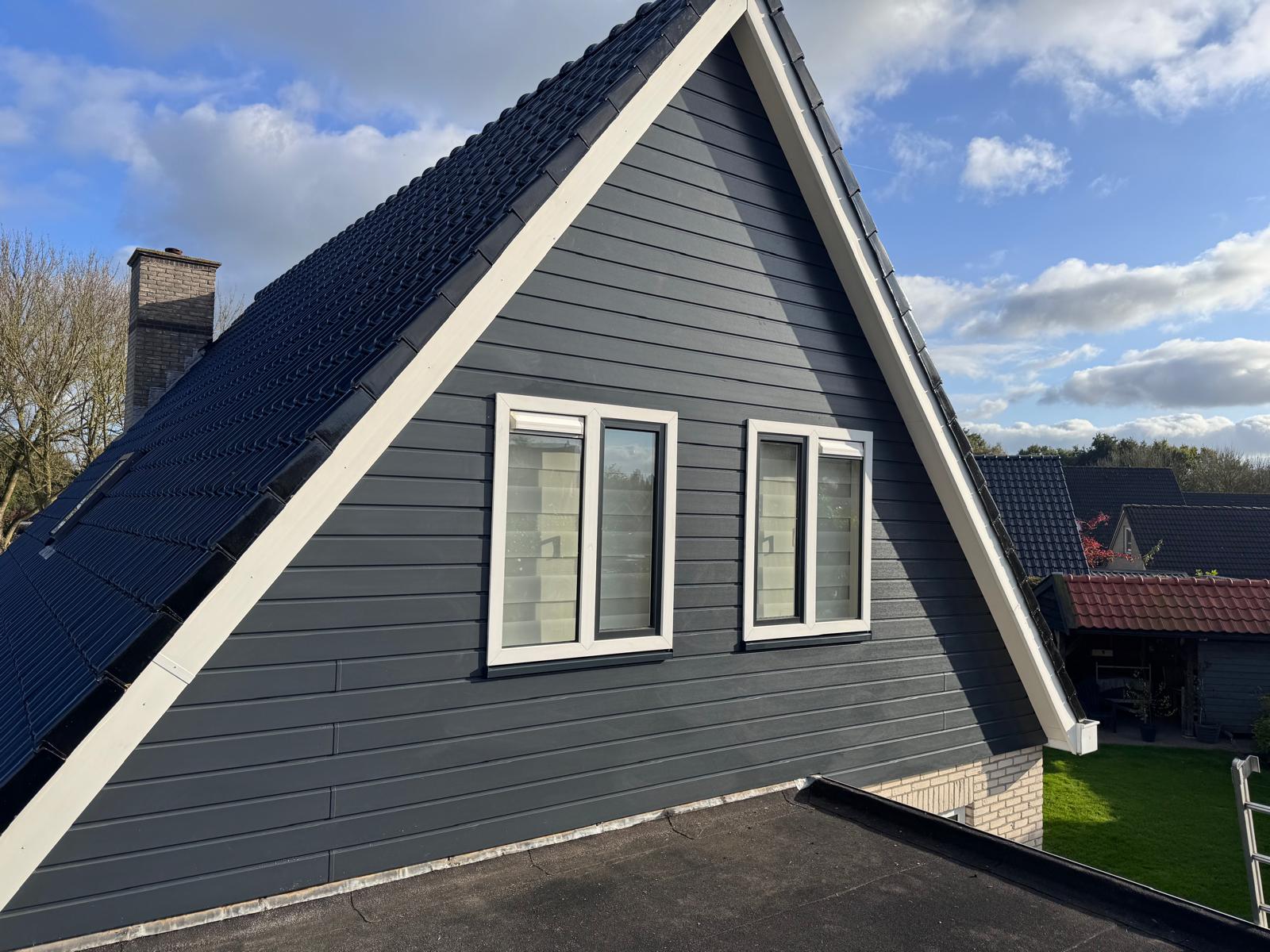 Bij deze woning hebben we de oude witte gevelbekleding volledig vervangen door onderhoudsarme, duurzame panelen in een stijlvolle antracietkleur. Het resultaat is een strakke, moderne uitstraling die perfect past bij de woning en het geheel een frisse, eigentijdse look geeft.
